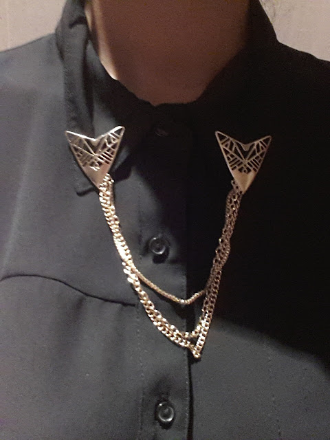 E depois encontrei na C&A, com 70% de desconto, umas aplicações para colocar nas golas das camisas. Foi amor à primeira vista, sobretudo porque funcionam como os pins e posso pôr e tirar nas camisas que quiser! Comprei dois modelos diferentes, um com corrente e outro sem corrente, nas duas cores disponíveis: dourado e prateado para combinar com looks diferentes.